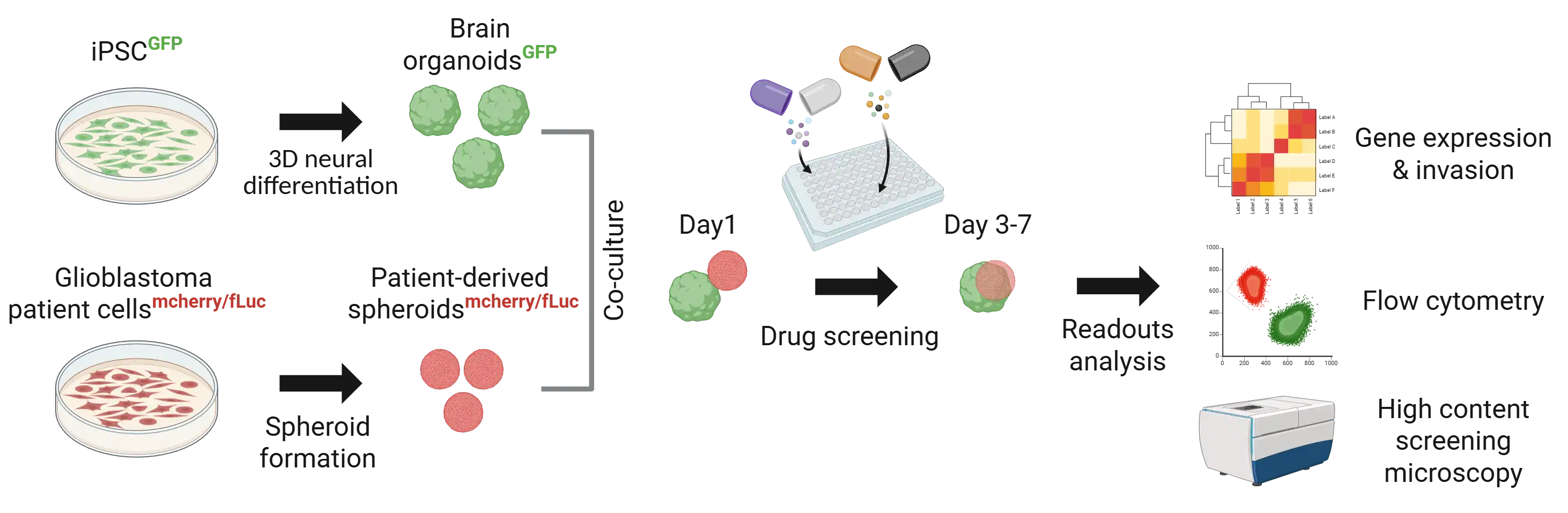 Fluorescent markers are used to engineer these cells before inoculating them onto healthy brain organoid. Our approach assesses the therapeutic window of drugs while analysing their dual impact on tumour invasion and gene expression in both tumour and healthy tissues, providing comprehensive insights.